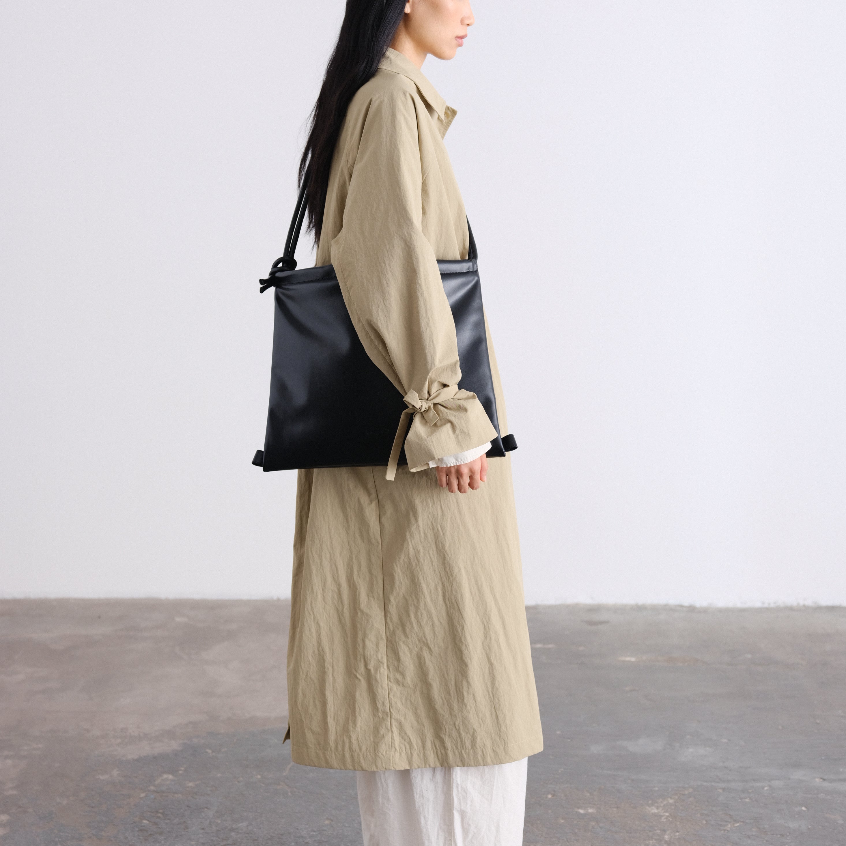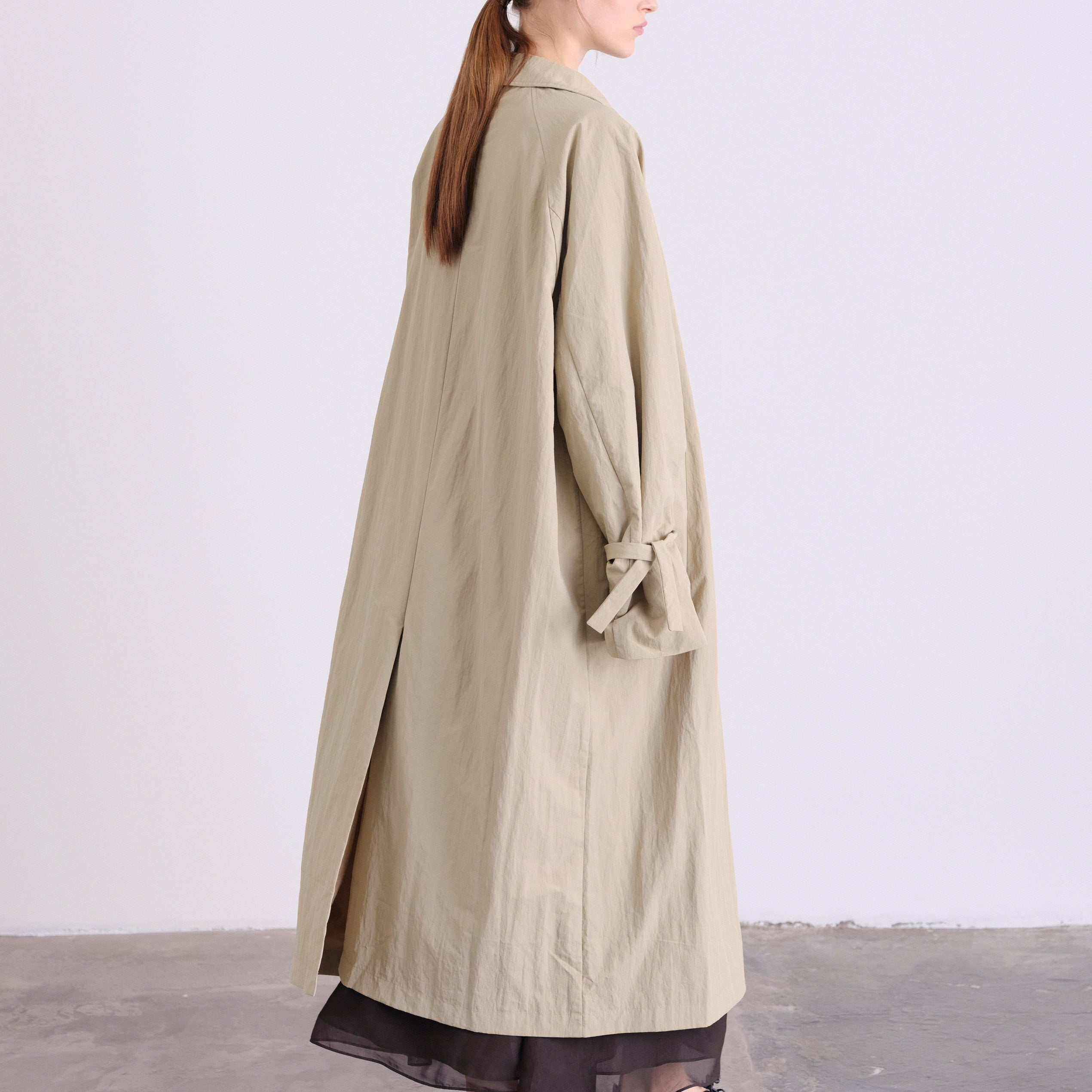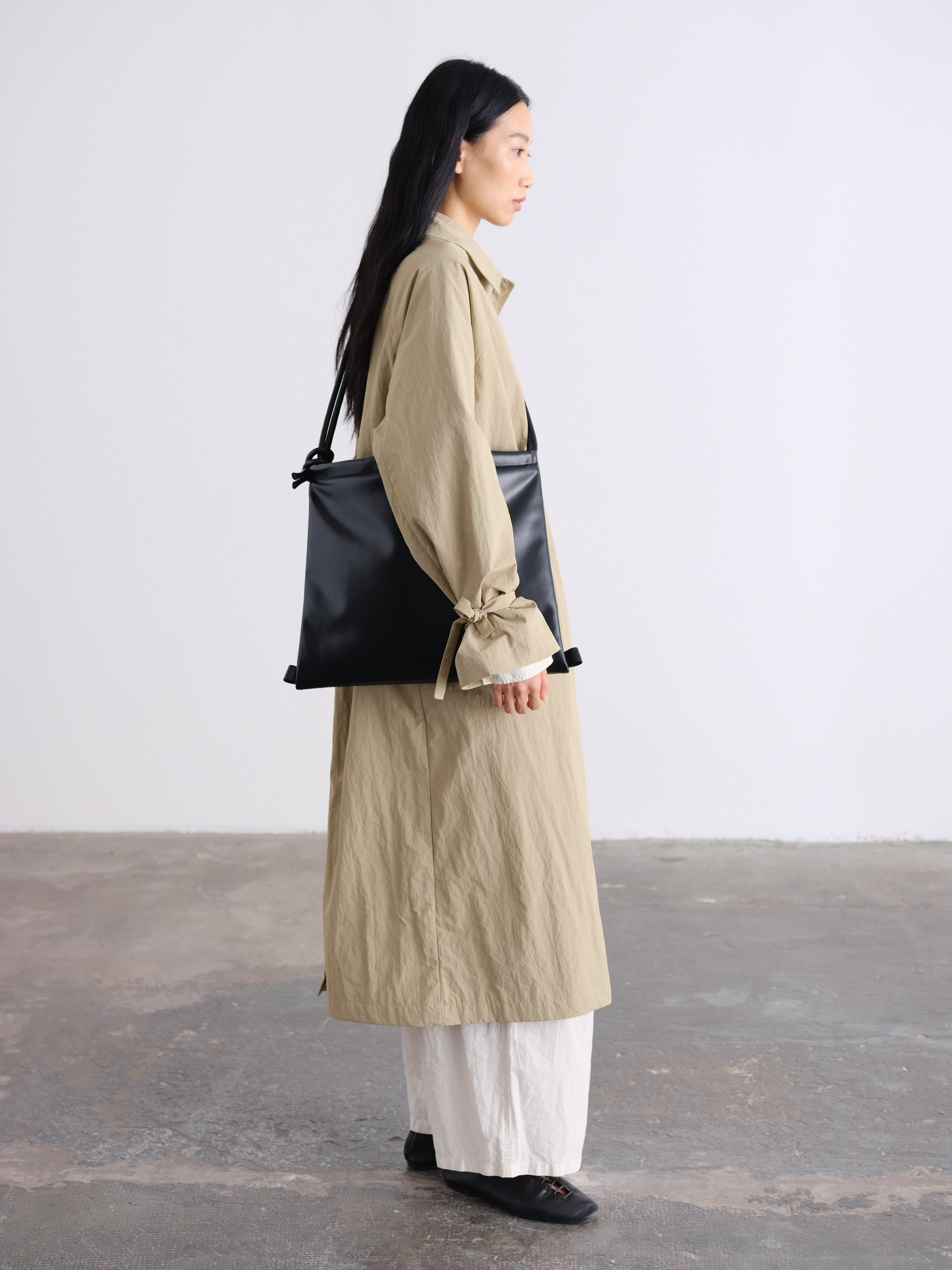 At the cuffs, slender ties offer a subtle gesture, to knot into delicate bows or let fall loose, a subtle detail that transforms the piece with ease.