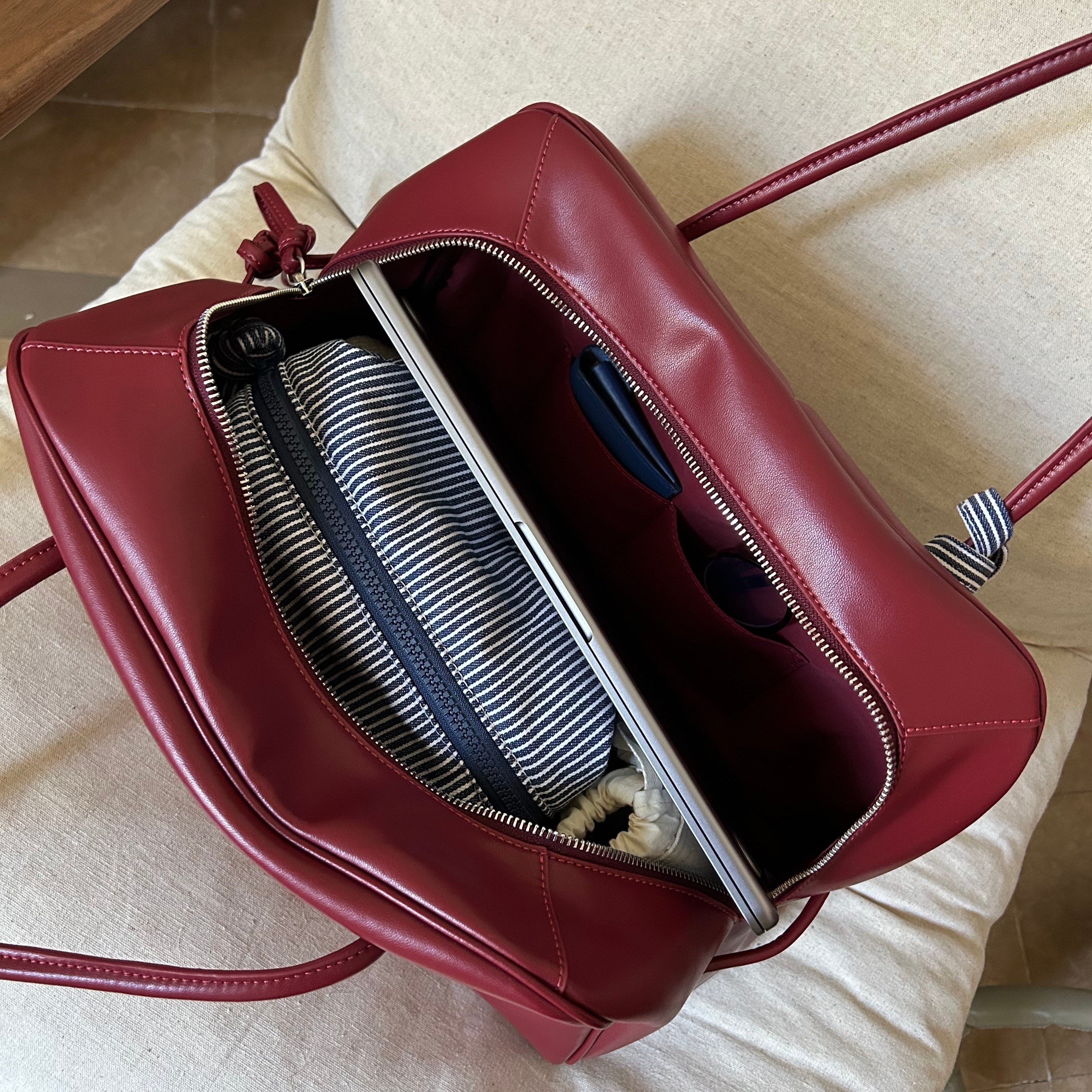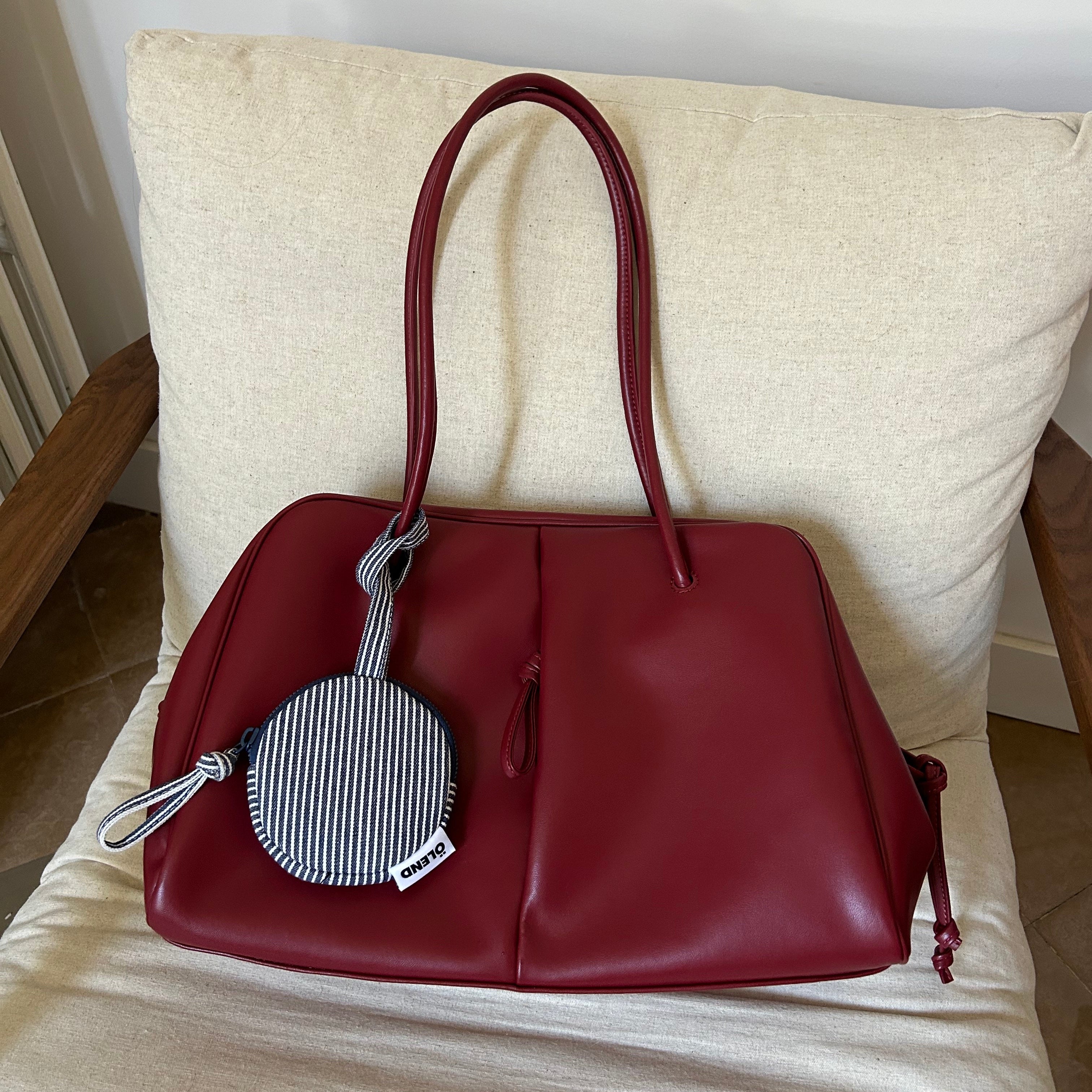 The bag is gorgeous, but I thought the cherry red would be more vibrant. The outer material is thin, and you can see a piece that blocks the shoulder strap near the hole. I think there should be another fabric inside. I hope you understand what I mean. Thanks.