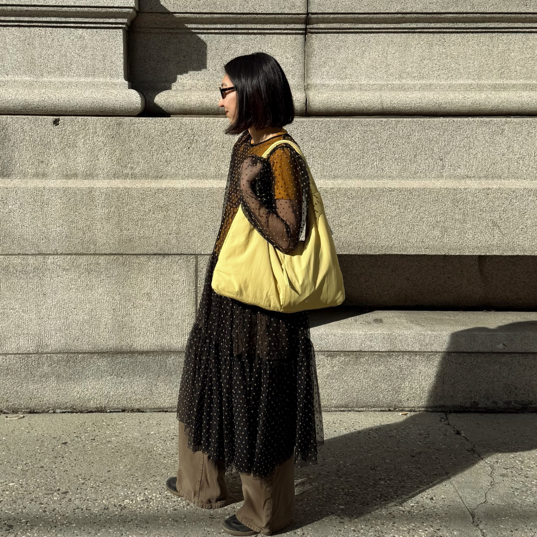 Very nice bag, beautiful color (butter yellow) and great feeling. The wide strap makes it nice to carry with a little weight. Good to know: the bottom is solid, it has kind of like a base so the bag does not get “slouchy” with more weight.